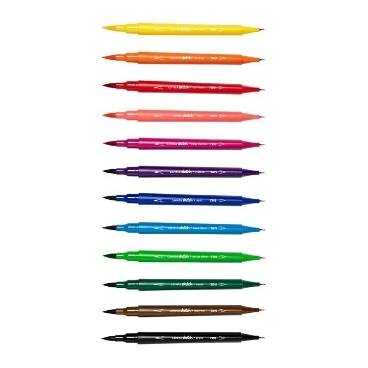Liberte sua imaginação, experimente novas técnicas e dê vida aos seus projetos com a Caneta Sketch Ponta Dupla Superfina + Pincel 12 Cores da Tris.