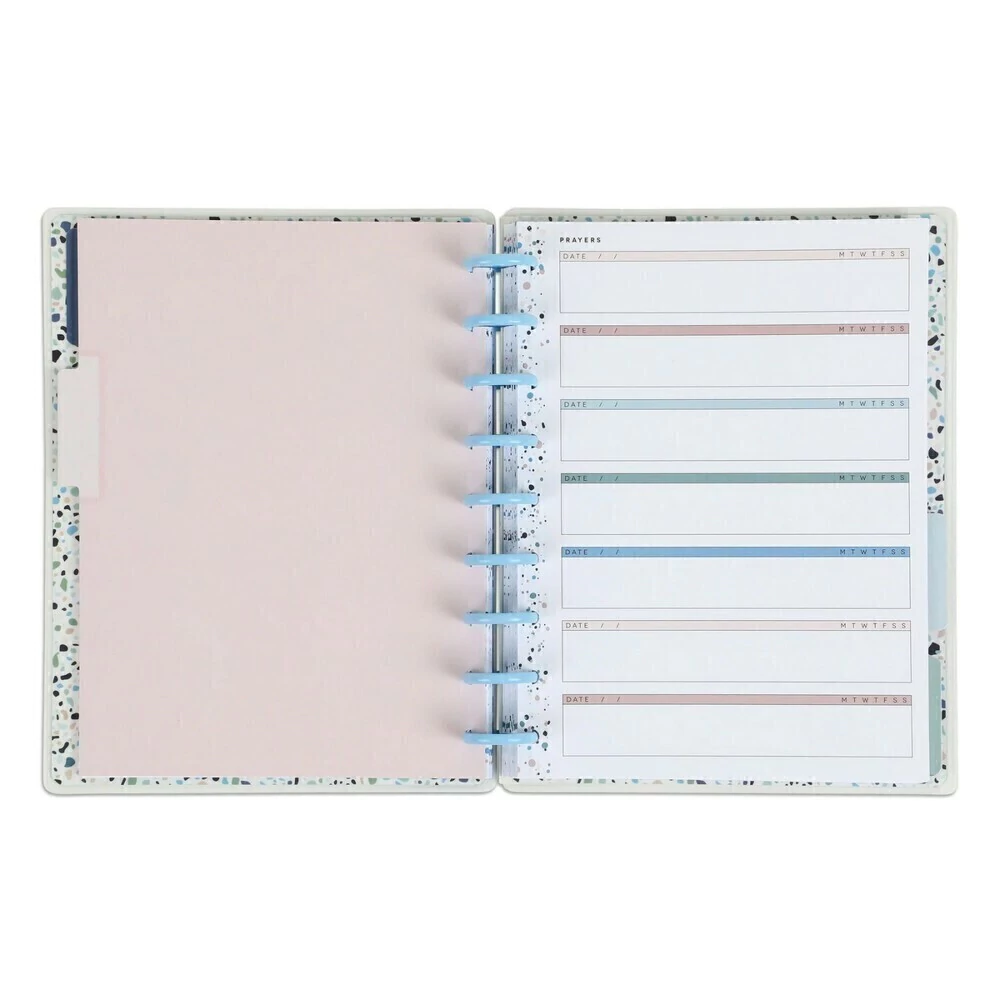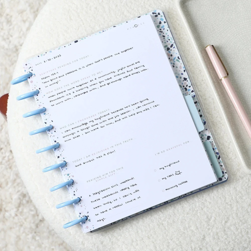 Use as instruções guiadas neste planejador baseado na fé para escolher leituras das escrituras, aplicações na vida real e registrar momentos encorajadores.
