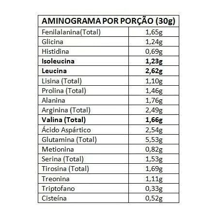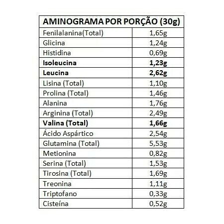 - Uma porção de 30g contém: 23g de Proteína, 5,5g de BCAA, 5,5g de Glutamina;